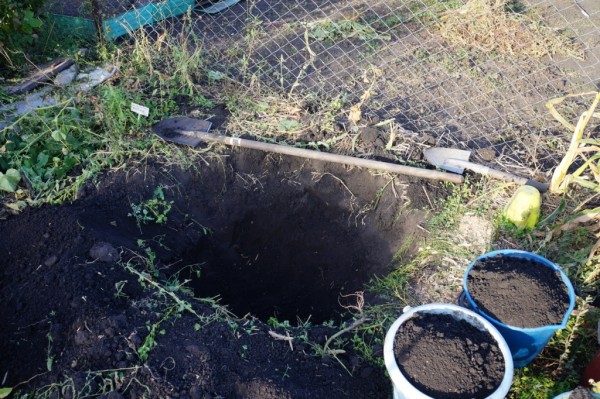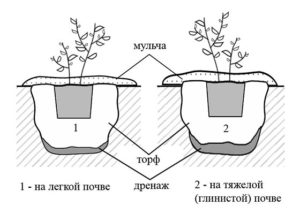- Plantation en barriques ou en conteneurs. Des trous de drainage d'un diamètre de 5 cm sont réalisés dans le fond des récipients d'une profondeur de 60 cm Un trou de taille appropriée est creusé à l'endroit choisi et le récipient y est immergé. En outre, le conteneur est recouvert d'un substrat et un buisson est planté.