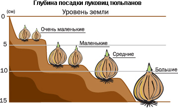 Par exemple, si vous avez un bulbe moyen ou grand - 4-5 cm de haut, la plantation doit être effectuée à une profondeur de 12-15 cm.Dans le cas d'un bulbe plus petit, par exemple 2-3 cm, les tulipes sont plantées dans le sol à 6 -9 cm.
