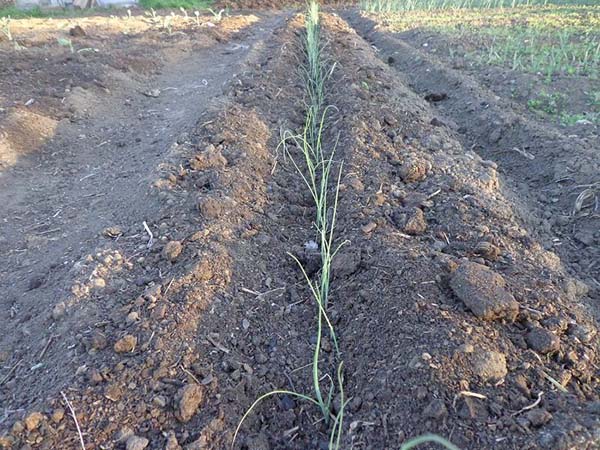 Les plants de poireaux sont plantés dans de petites rainures en forme de V d'une profondeur de 10-12-13 cm et à une distance de 15-20 cm les uns des autres et à une distance entre les rangs - 35-45 cm. Un tel schéma de plantation sera idéal pour le nivelage ultérieur des plates-bandes.