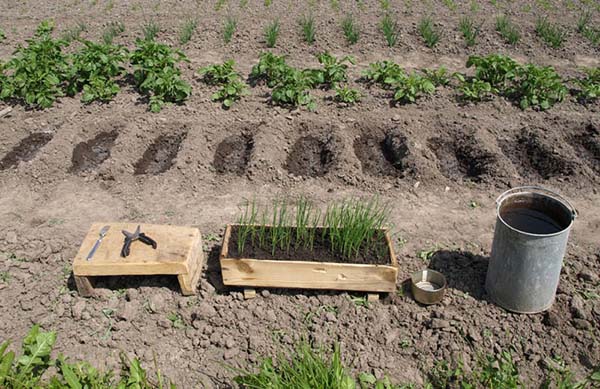 Important! N'oubliez pas de saupoudrer légèrement les rainures (sillons) d'un mélange d'humus et de cendre avant de planter les oignons (1 seau d'humus par bidon de 0,5 litre de cendre).