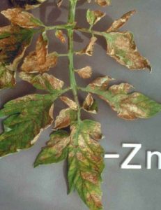 - Désavantage zinc elle est aussi souvent la cause de la chlorose = jaunissement des feuilles des plants de tomates, procédant de la même manière à une carence en manganèse, cependant, les taches dans ce cas deviennent brun orangé.