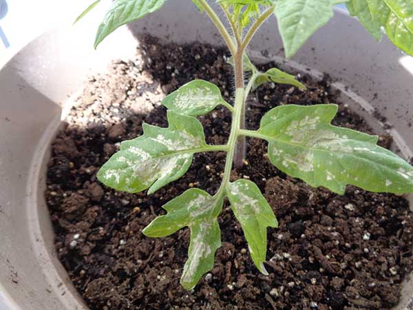 Attaque aleurodes pour tomates de serre fait jaunir, sécher et tomber les feuilles. Cependant, les premiers signes de la présence de ce ravageur sont la formation de taches blanches brillantes (floraison blanche) sur les feuilles.