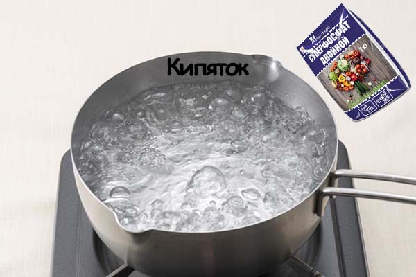 - Dissoudre 100 grammes de superphosphate (de préférence le double) dans 1 litre d'eau bouillante, laisser infuser pendant 12 à 24 heures, en remuant de temps en temps, diluer 1 à 10 avec de l'eau (c'est-à-dire mélanger avec 10 litres d'eau) et de l'eau à la racine.