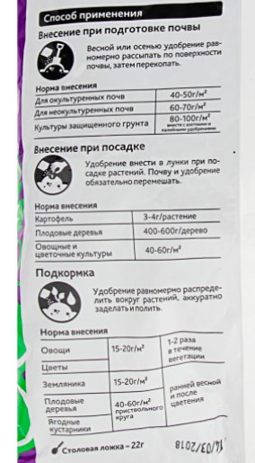 Pour les dosages calculés pour fertiliser et nourrir diverses cultures, voir l'emballage (dans les instructions). Avoir contenu de différents fabricants nutriments (phosphore et azote) pouvez différer, en conséquence, les taux de consommation seront ajustés.