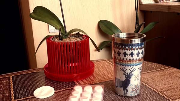 Arrosez l'orchidée avec de l'acide succinique avec une solution standard (1 comprimé ou 0,1 gramme d'ingrédient actif pour 1 litre, et de préférence 0,5 litre d'eau).