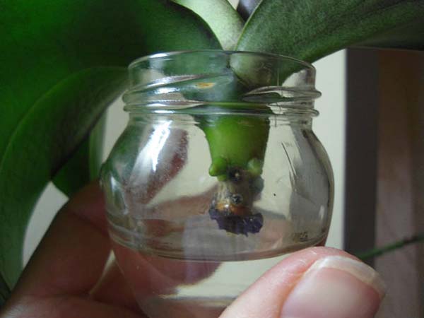 - Préparez une solution et mettez-y une orchidée sans racines (uniquement le collet) pendant 10 à 15 minutes (certains recommandent jusqu'à 30 minutes).