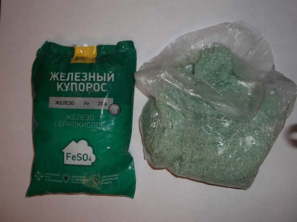 Remarque! Le fer vitriol est fongicide de contact, c'est-à-dire qu'il ne pénètre pas à l'intérieur de la plante, mais agit uniquement à sa surface et, par conséquent, est facilement lavé par la pluie. Par conséquent, en règle générale, plusieurs traitements sont nécessaires (surtout après les pluies).