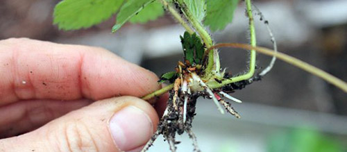 Cela se produit également de cette façon (surtout si les fraises sont cultivées sur un matériau de couverture): la moustache pend en l'air, ne se fixe pas dans le sol, surtout lorsque la moustache est courte et épaisse, mais elle construit toujours un bon système racinaire. Cet exutoire à racines ouvertes peut être transplanté directement dans un nouvel emplacement.