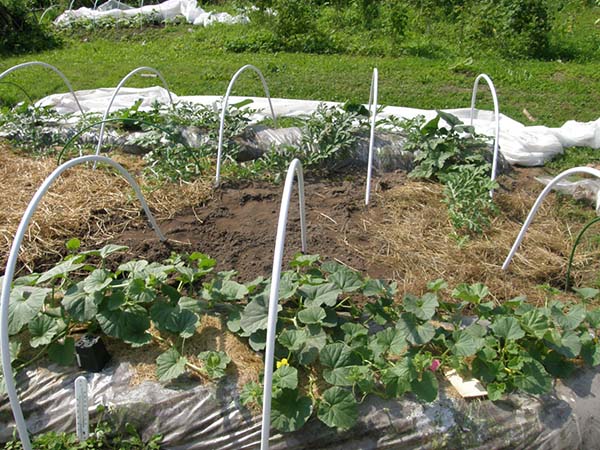 En ce qui concerne la procédure elle-même, préparez d'abord le lit de jardin et creusez des trous. Couvrez ensuite d'agrofibre, coupez de petits trous en forme de croix dans lesquels vous planterez plus tard les semis ou plantez des graines (avec semis direct dans le sol). Et en plus, vous pouvez également mettre une serre sur des arcs.