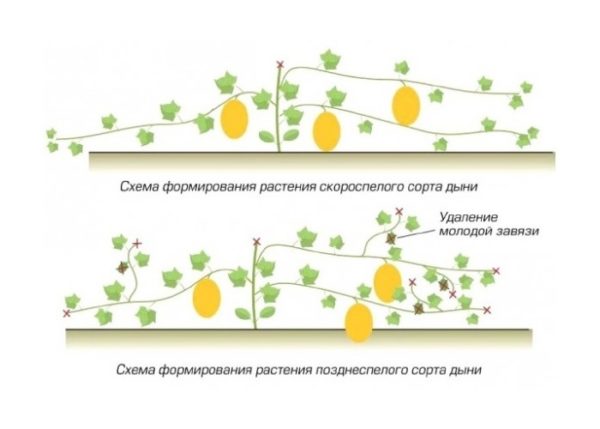 En fonction de la maturité à gros fruits et précoce, 2-4 des fouets les plus puissants du premier ordre et plusieurs du second sont conservés sur une plante (certaines variétés portent des fruits sur eux). Dans ce cas, il ne reste que 1-2 fruits sur 1 pousse, c'est-à-dire seulement environ 2 à 8 melons, en d'autres termes, les fruits en excès doivent être éliminés seuls (rationnement de la récolte).