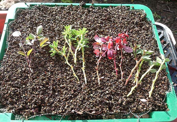 Alternativement, vous pouvez enraciner dans un verre rempli de sable ou de terre et de perlite, en approfondissant les boutures à un angle de la moitié de leur longueur.