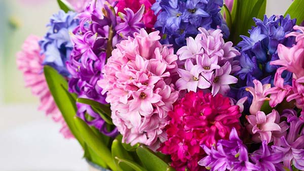 Mais un bouquet de jacinthes de différentes nuances est plus magnifique, coloré et solennel: