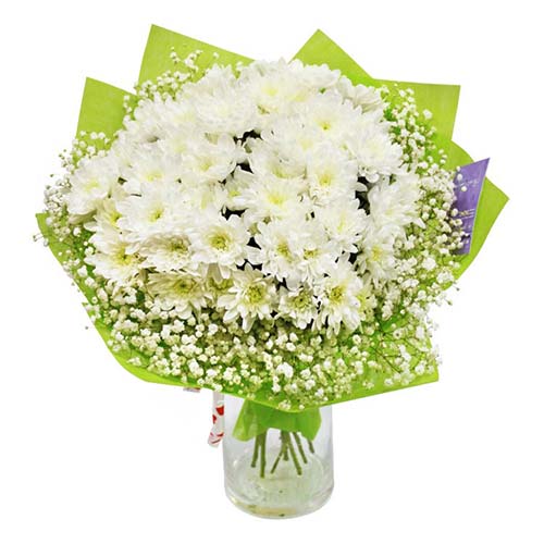 Comme vous pouvez le voir sur la photo, un bouquet composé uniquement de chrysanthèmes (bicolores) a l'air très mignon: