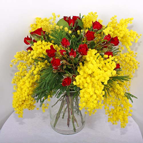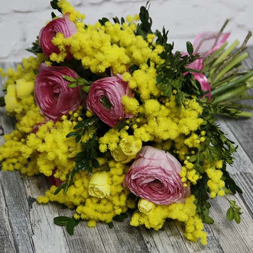 Cependant, si vous souhaitez diversifier la composition et la rendre un peu plus intéressante, alors la combinaison idéale au mimosa... Un tel bouquet sera encore plus printanier et frais!