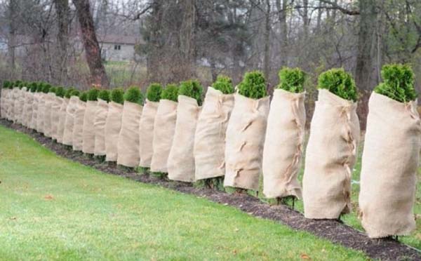 - Pour protéger le thuya du soleil peut être utilisé gaze, papier kraft, tissu en coton blanc (drap, housse de couette), sacs en polypropylène, toile de jute, maille polymère.
