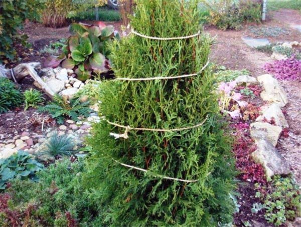 - Vous pouvez simplement attacher le thuya en cercle avec de la ficelle (il est préférable d'aller d'abord de bas en haut, puis de haut en bas), en pliant les branches latérales vers le tronc principal.