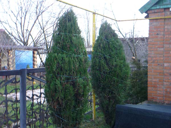 Mais il est peu probable que les thuyas déjà adultes et / ou grands se brisent sous le poids de la neige (mais cela arrive), mais ils devraient être couverts pour une autre raison - pour protéger les aiguilles des coups de soleil au début du printemps (février-avril).