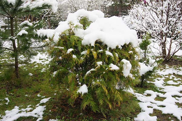 Les jeunes thuyas (de un à 4-5 ans) sont assez tendres, à cause de quoi ils peuvent se déformer sous la couverture de neige. Lorsque la neige colle aux branches, elles se plient fortement et peuvent simplement se briser sous le poids des masses de neige.