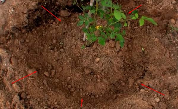 - Avant d'appliquer de l'engrais, le long du diamètre du buisson (ou mieux encore un peu plus, au moins, en reculant de 15 à 20 centimètres), vous devez faire une rainure annulaire, pour ainsi dire, une rainure (trou).