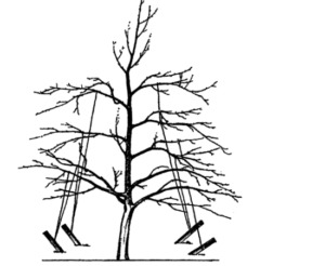 Au printemps, lorsque les bourgeons commencent à gonfler, vous devez tirer les branches vers le bas et les attacher (les attacher) avec de la ficelle (fil de lin) au tronc principal de l'arbre (pas la meilleure option) ou à des piquets dans le sol (optimal).