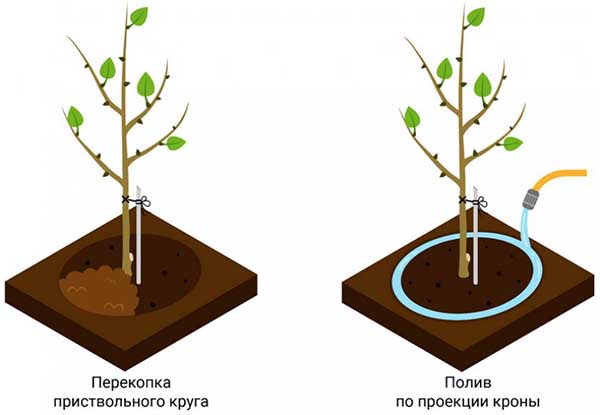 Et avant d'arroser, il est conseillé de desserrer le cercle du tronc d'arbre, et après l'arrosage, de le pailler (avec de la tourbe, du compost, de l'humus) afin que l'humidité soit mieux retenue (elle ne s'évapore pas plus longtemps).