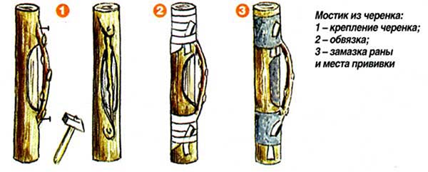 Si vous avez négligé la recommandation de créer un abri de protection hivernal contre les rongeurs et que, par conséquent, ils ont gravement endommagé l'écorce dans la partie inférieure du tronc, pour ainsi dire, rongé avec une bague, puis pour sauver l'arbre, vous pouvezplanter un pommier avec un pont.