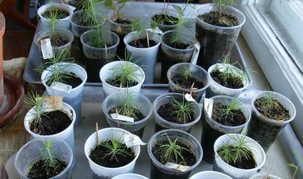 Conseil! Si vous plantez dans des conteneurs individuels, il est toujours préférable de semer plusieurs graines à la fois. Premièrement, le taux de germination des conifères est assez faible (10 à 50%), et deuxièmement, si trop de germes, vous pouvez choisir les pousses les plus fortes et simplement retirer le reste.