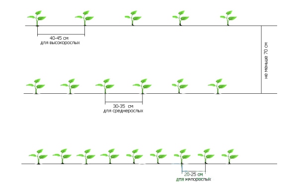 Mais vous pouvez également planter en damier, sur 2 rangées (plus précisément, rangées), tandis que la distance entre les rangées doit être d'au moins 40 cm, et de préférence de 50 à 60 cm.